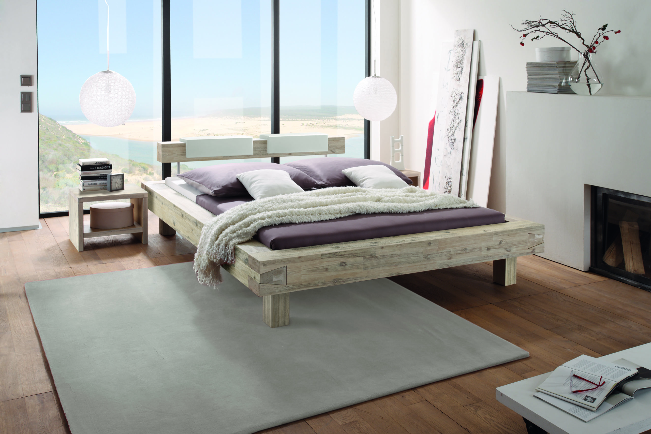 Massivholzbett, Akazie natur, gebürstet, lackiert.